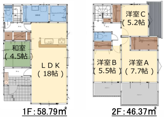 | 間取内容 | LDK18畳 1階 1室和室4.5畳 1階 1室洋室7.7畳 2階 1室洋室5.5畳 2階 1室洋室5.2畳 2階 1室 | ||
