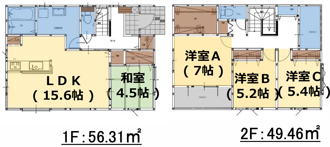 | 間取内容 | LDK15.6畳 1階 1室和室4.5畳 1階 1室洋室7畳 2階 1室洋室5.4畳 2階 1室洋室5.2畳 2階 1室 | ||